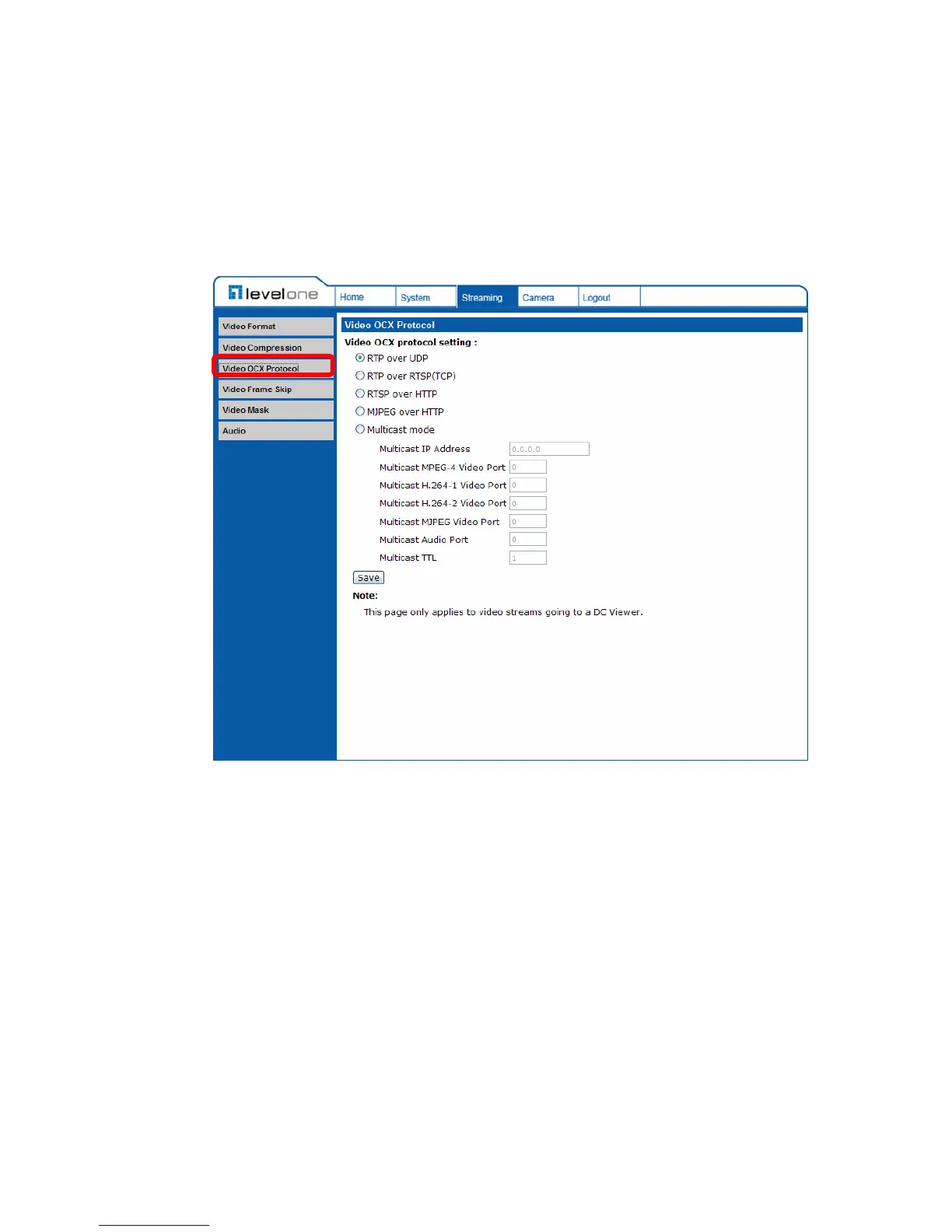 In the Video OCX protocol setting page, users can select RTP over UDP, RTP