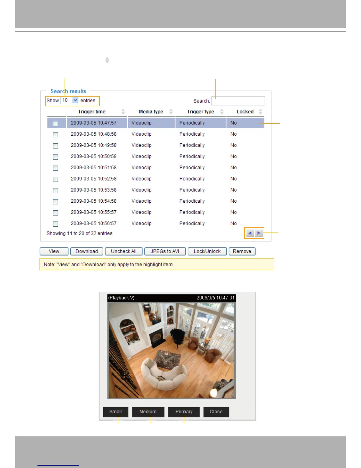 The following is an example of search results. There are four columns: Trigger time, Media type, Trigger