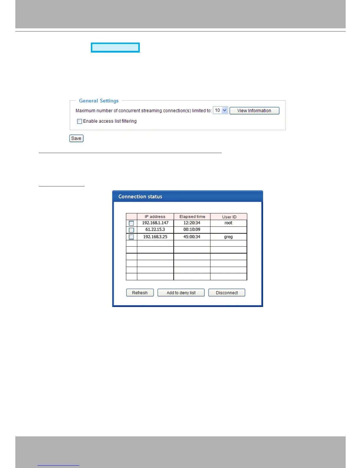 ■ IP address: Current connections to the Network Camera.