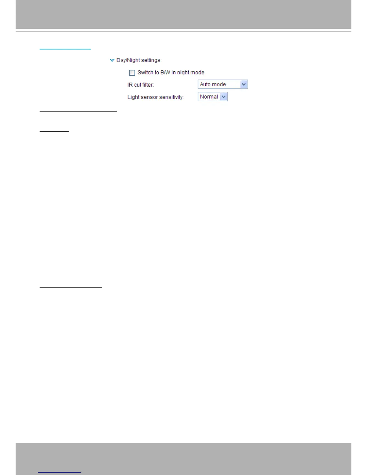 In day mode, the Network Camera switches on the IR cut lter at all times to block infrared light from