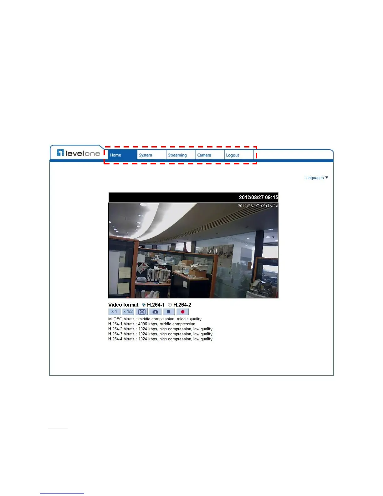 There are five main tabs including <Home>, <System>, <Streaming>, <Camera> and