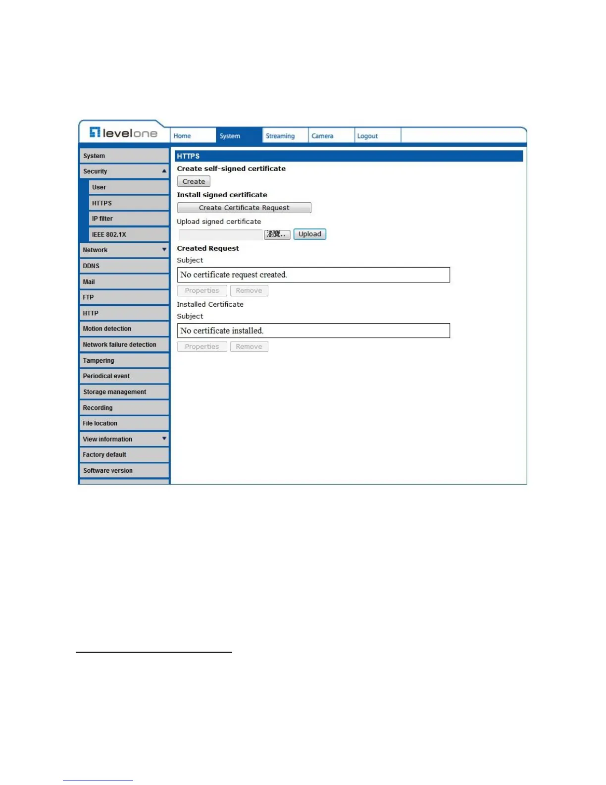 To use HTTPS on the IP Camera, a HTTPS certificate must be installed. The HTTPS