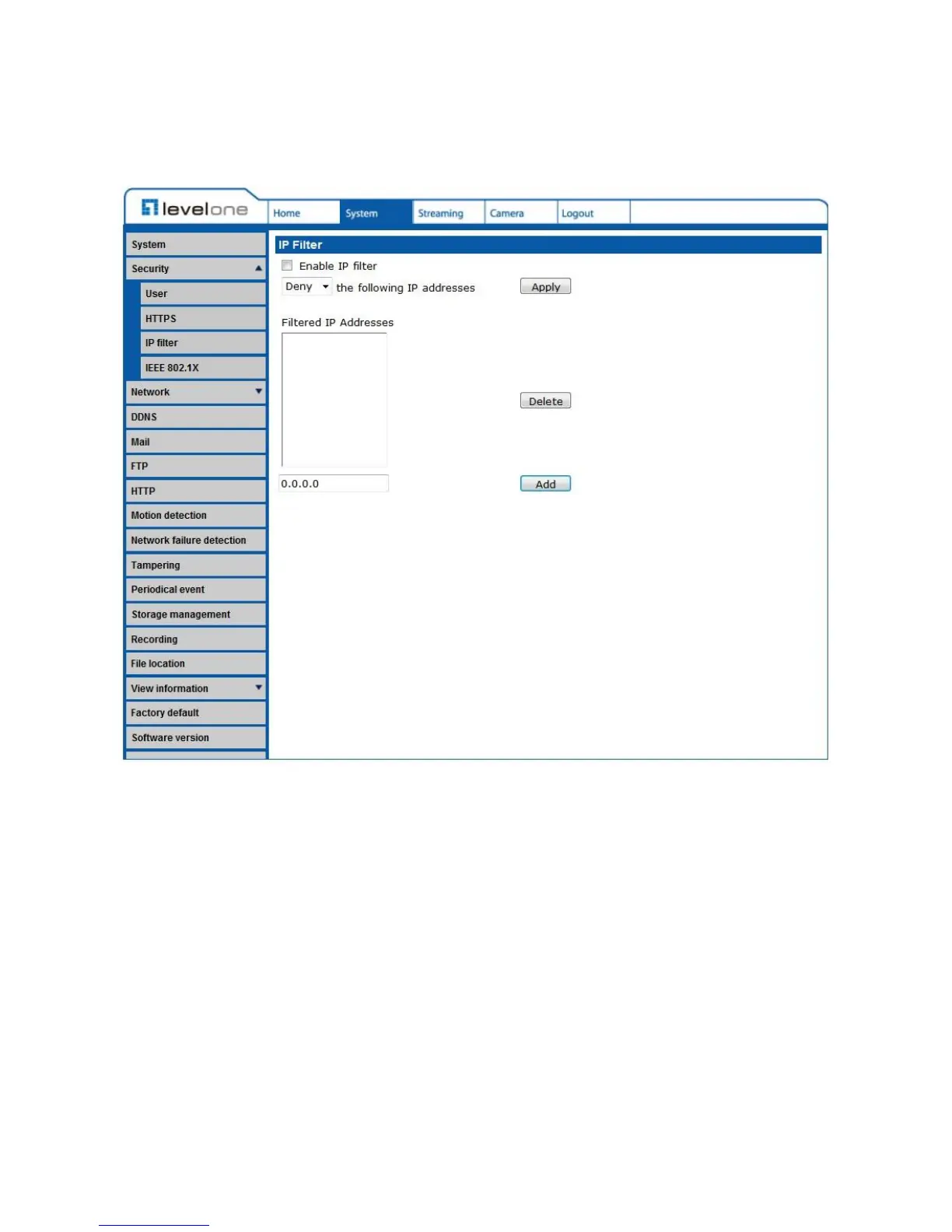 Using the IP filter, access to the IP Camera can be restricted by denying/allowing specific IP