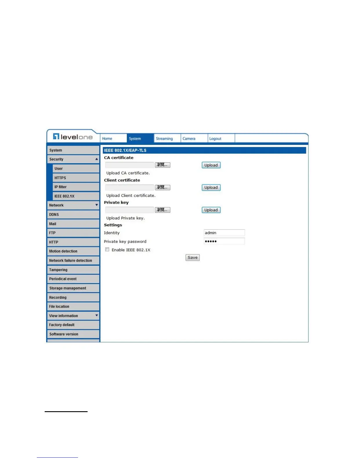 The IEEE 802.1X setting can be found under this path: System> Security> IEEE 802.1X.