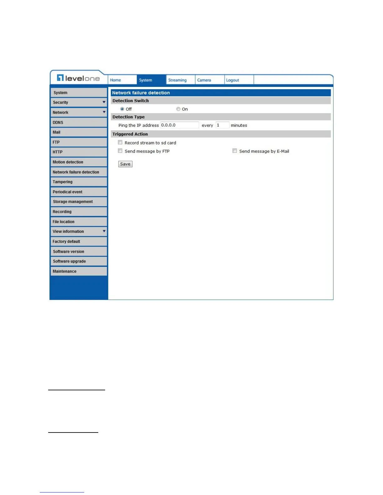 Network Failure Detection allows the IP Camera to ping another IP device (e.g. NVR, VSS,