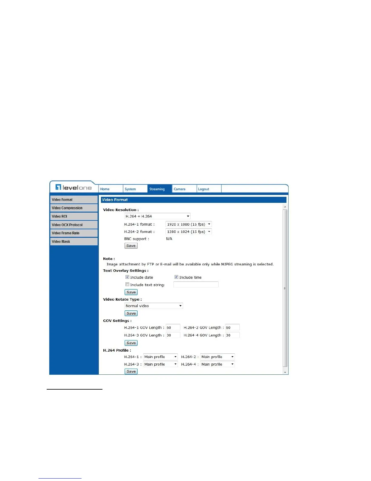 In the Streaming submenus, the Administrator can configure specific video resolution, video