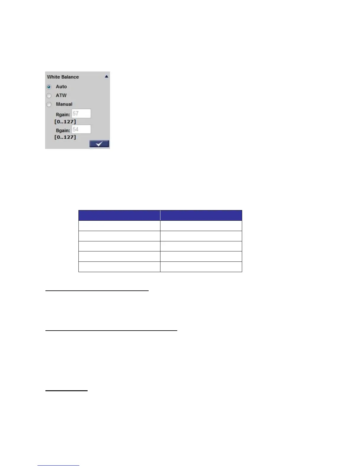 number between 0 ~127 of “Rgain/ Bgain” item to gain the red/ blue illuminant on the Live
