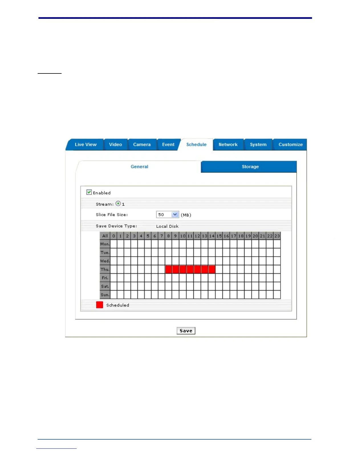 recording during the scheduled period. Note that only video data will be recorded. User can select which