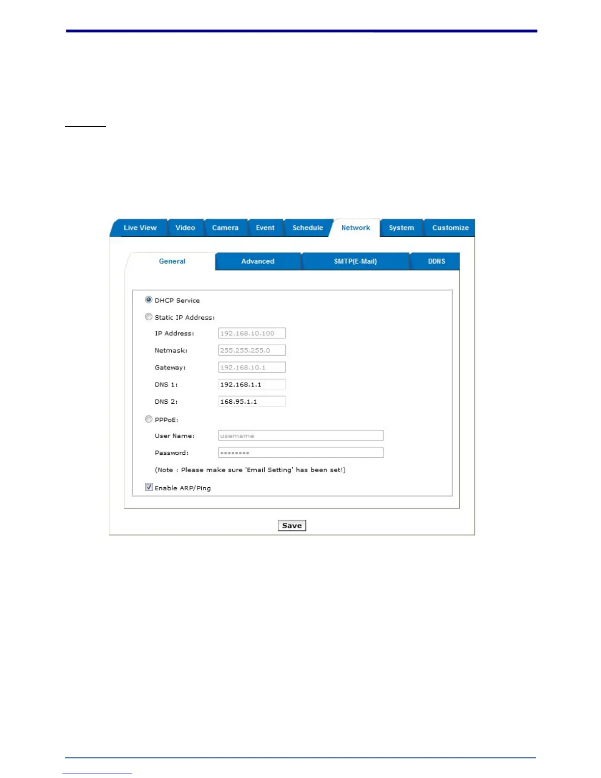 Device IP configuration, includes DHCP and Static IP setting. “Enable ARP/Ping” enable device to accept