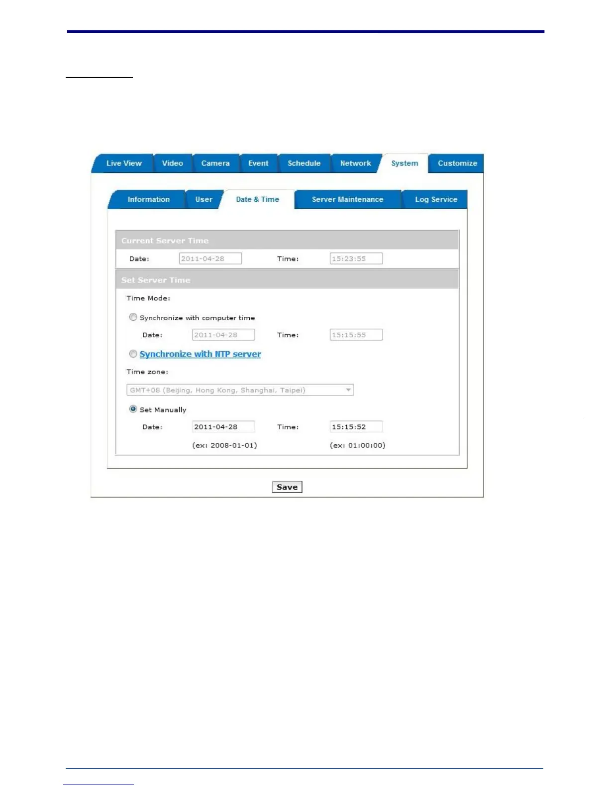 System date/time configuration. Options of synchronizing with PC and NTP server are provided for