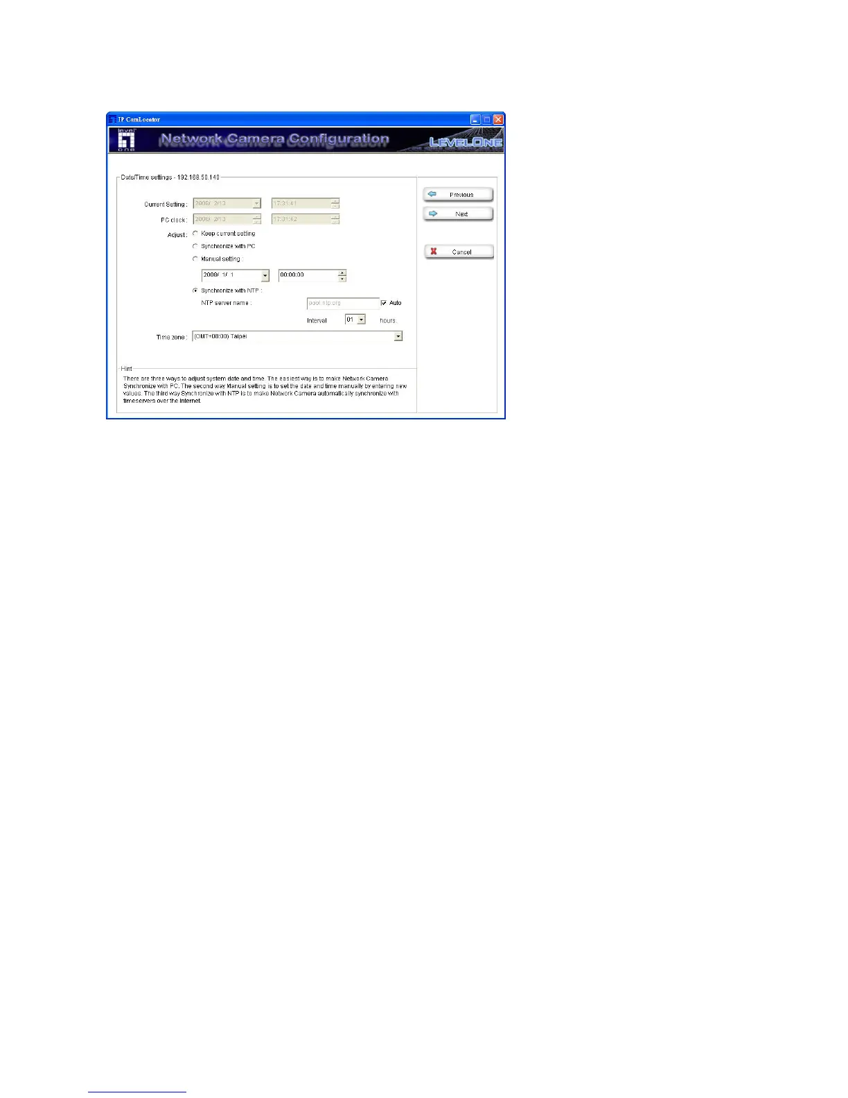 Date/Time settings: You can set the date/time of the network camera here. See ”Hint” for details.