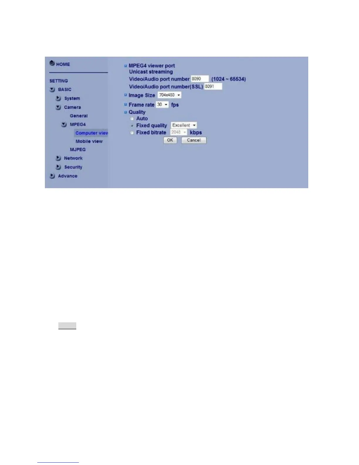 Fixed Bitrate:Set the bit rate of MPEG4 image transmission for a line. Selectable values are 64, 128, 256,