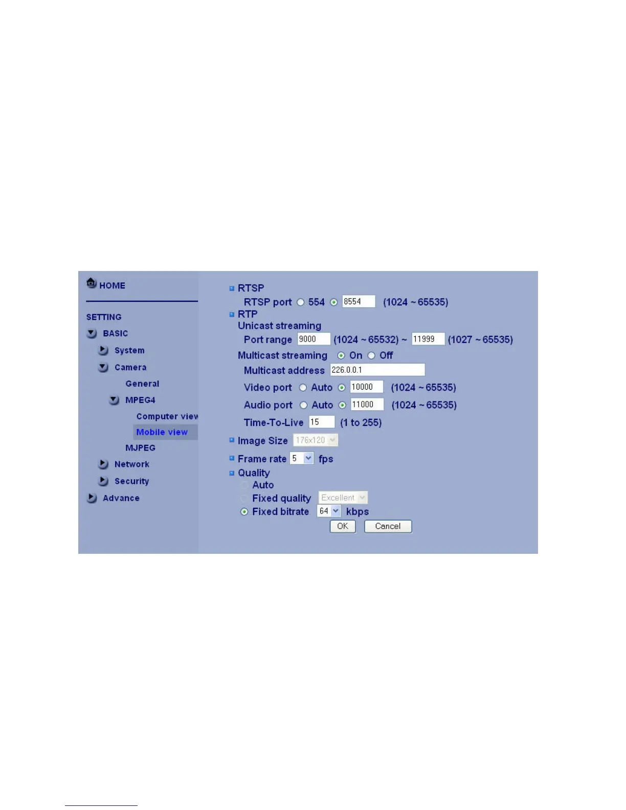 Fixed Bitrate:Set the bit rate of MPEG4 image transmission for a line. Selectable values are 64, 128, 256,