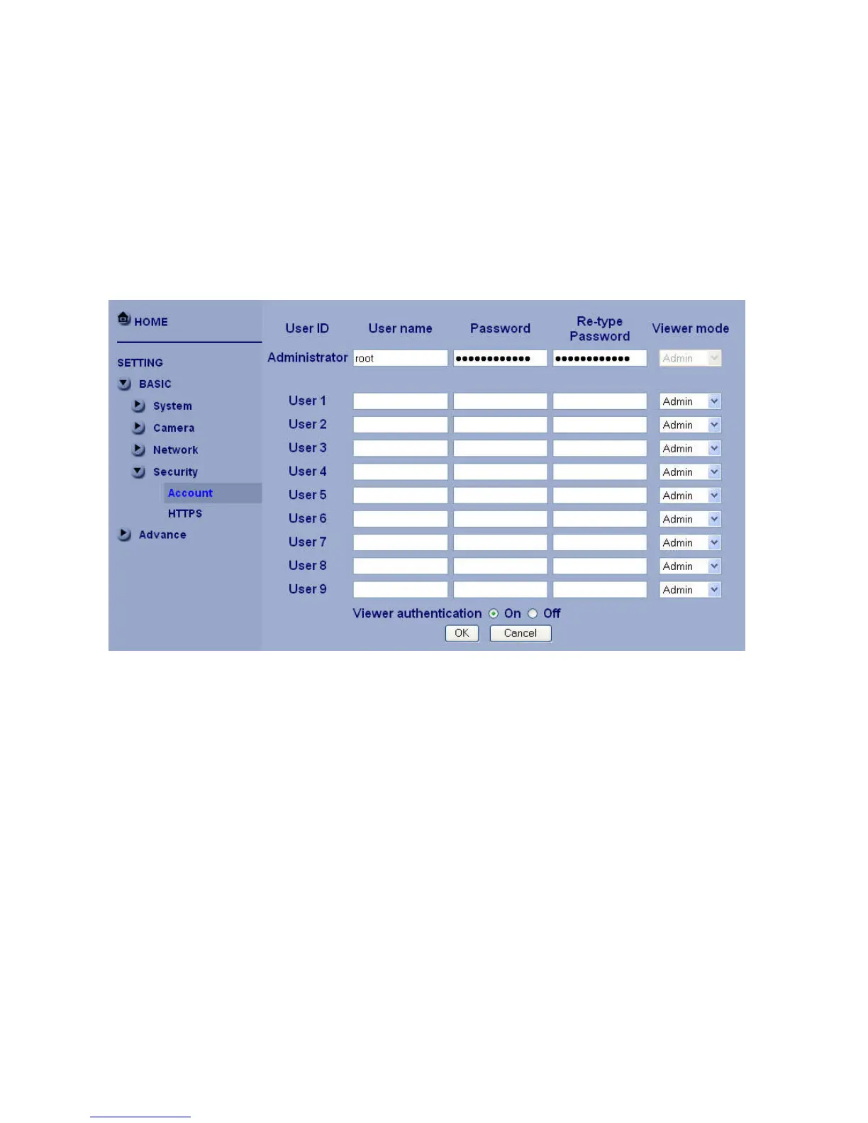 menu to set the user names and passwords of Administrator and up to 9 different users (User 1 to User 9),
