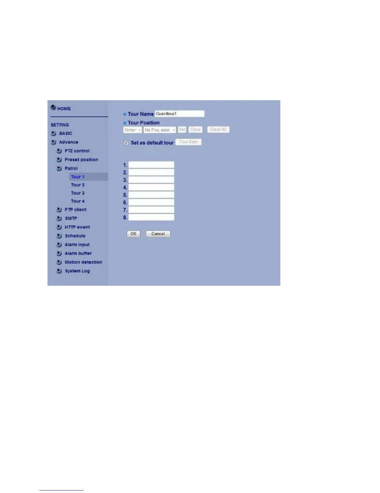 Tour Start:To click Tour Start, and the camera moves on patrol tour.