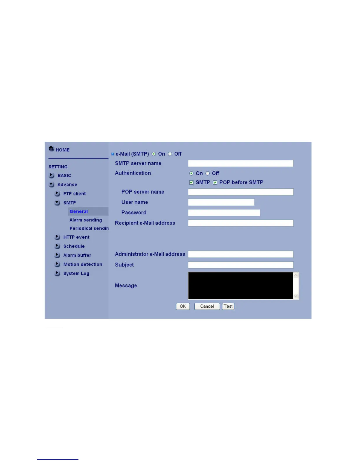built-in motion detection function. The image file can also be sent periodically. E-Mail (SMTP) setting menu