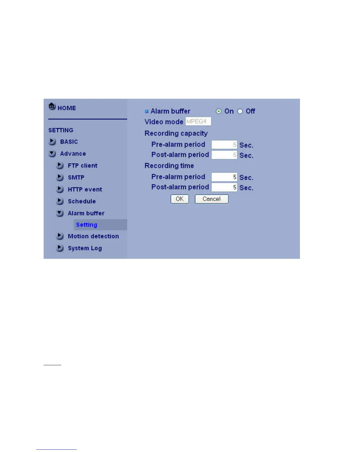 Pre alarm period:Type it with recording time of the image/audio before the alarm detection.