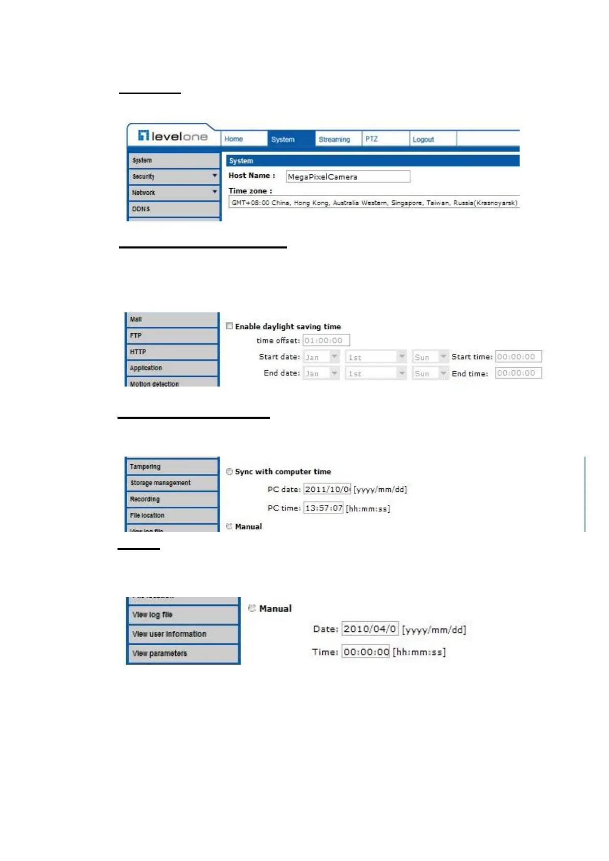 The Administrator can set video date, time and day manually. Entry format