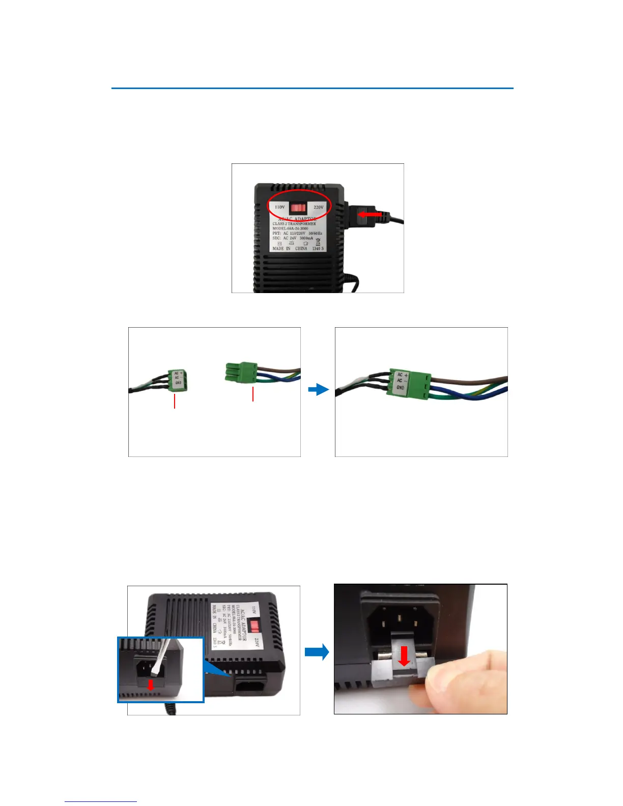 1. Slide the voltage switch to set the adapter voltage according to the voltage standard in your