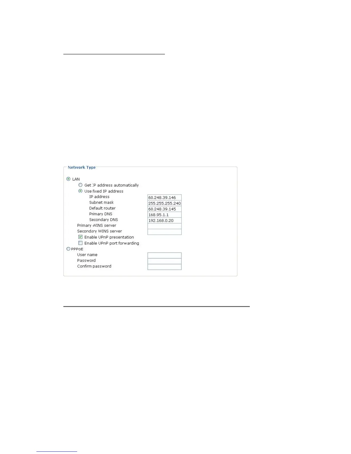 2. Go to Configuration > Network > Network Type. Select LAN > Use fixed IP