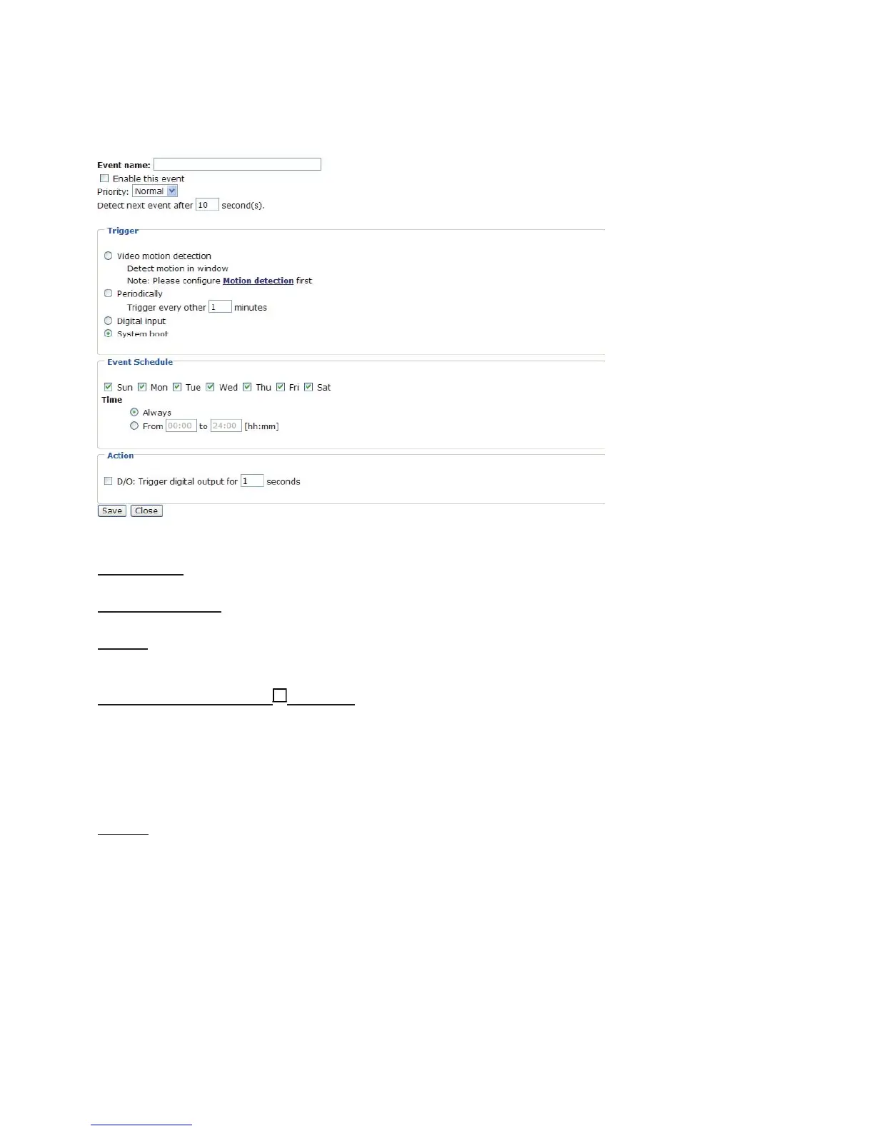 Trigger: Also referred as the cause or stimulus, defines when to trigger the Network Camera.