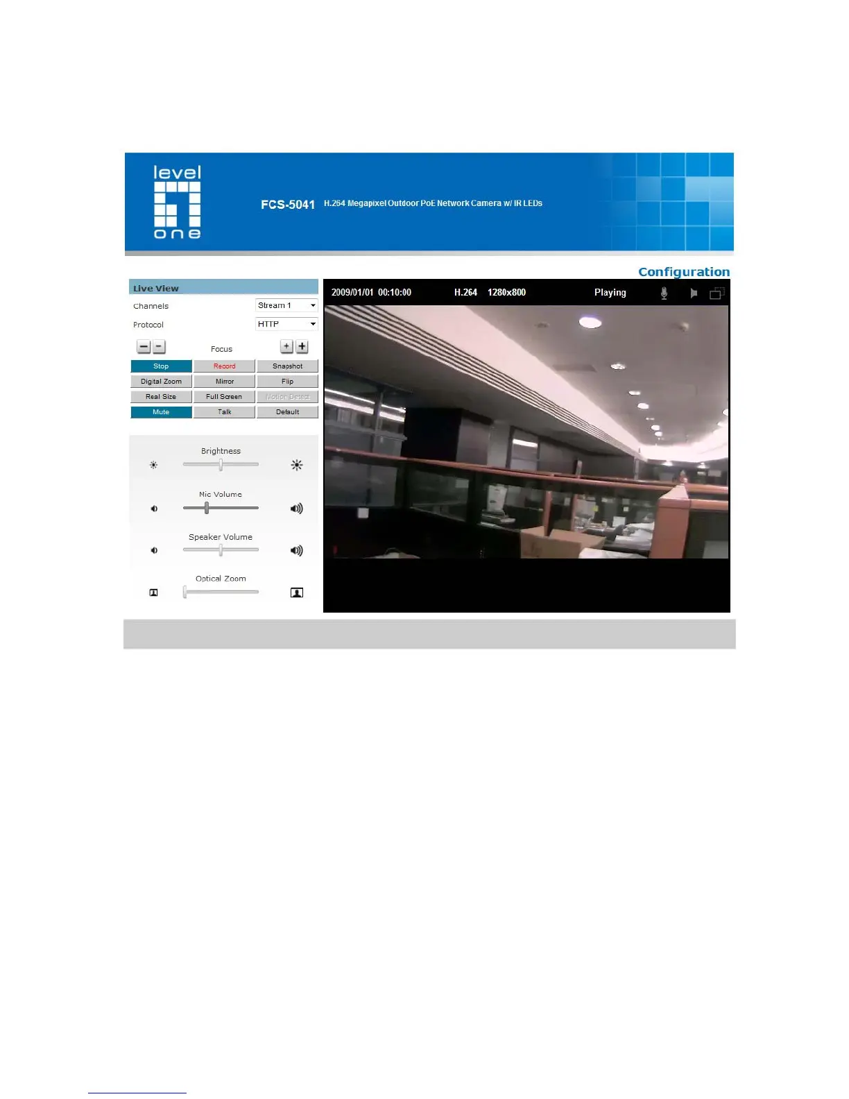 Live View is the default page that opens when accessing the camera. Live video is displayed
