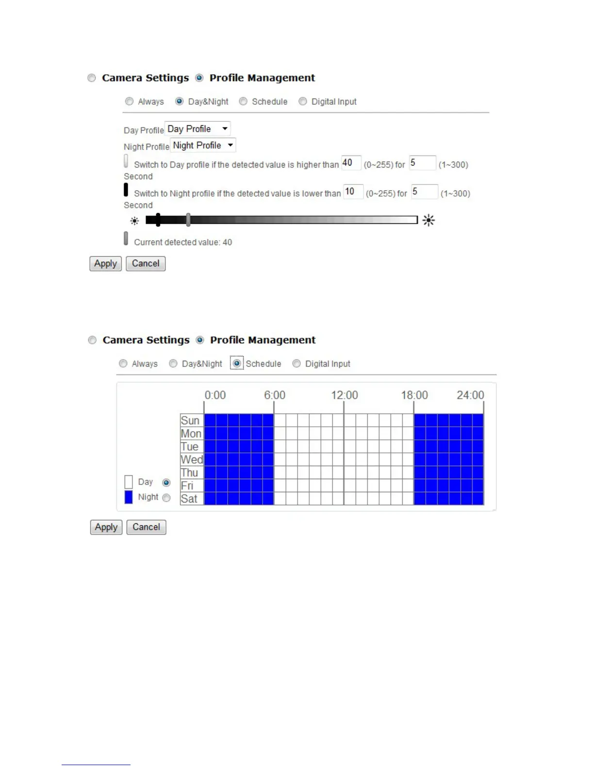 Day & Night - Select Day & Night to schedule two profiles for day and night. Select profiles from