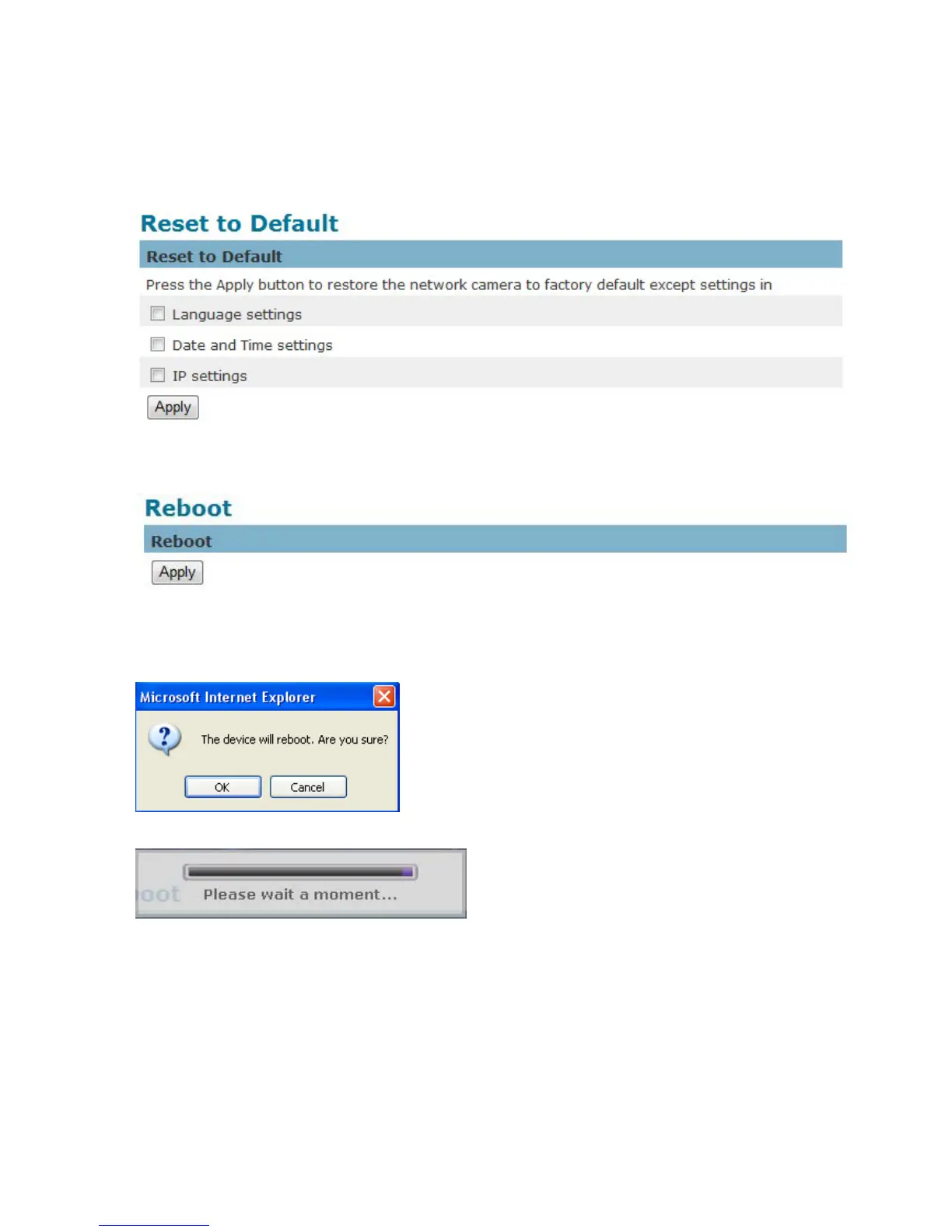 This feature will reboot the camera. Click Apply to begin. A message will pop up asking “The