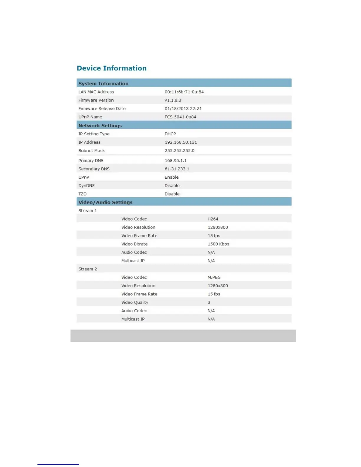 Video/Audio Settings Displays the complete video/audio settings information of the camera.