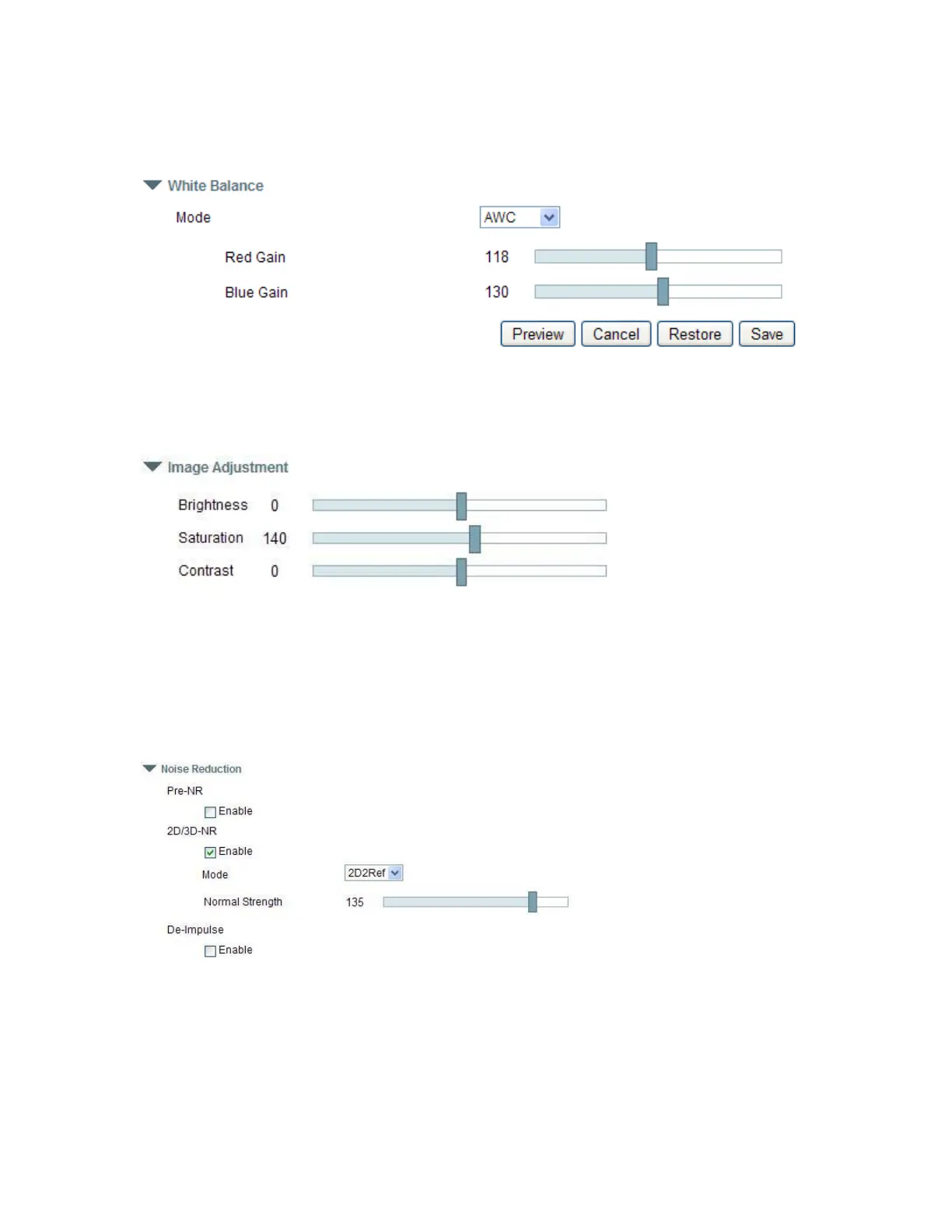 Outdoor and Manual modes. Set the Red Gain and Blue Gain are active.