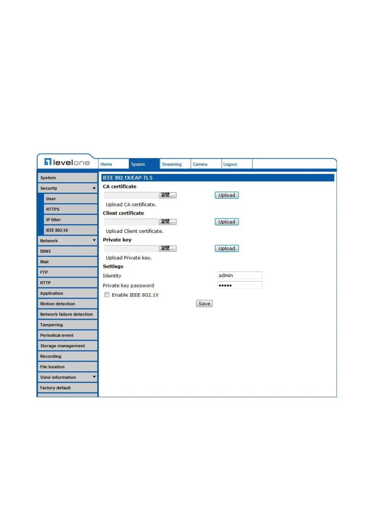 The IEEE 802.1X setting can be found under this path: System> Security> IEEE 802.1X.
