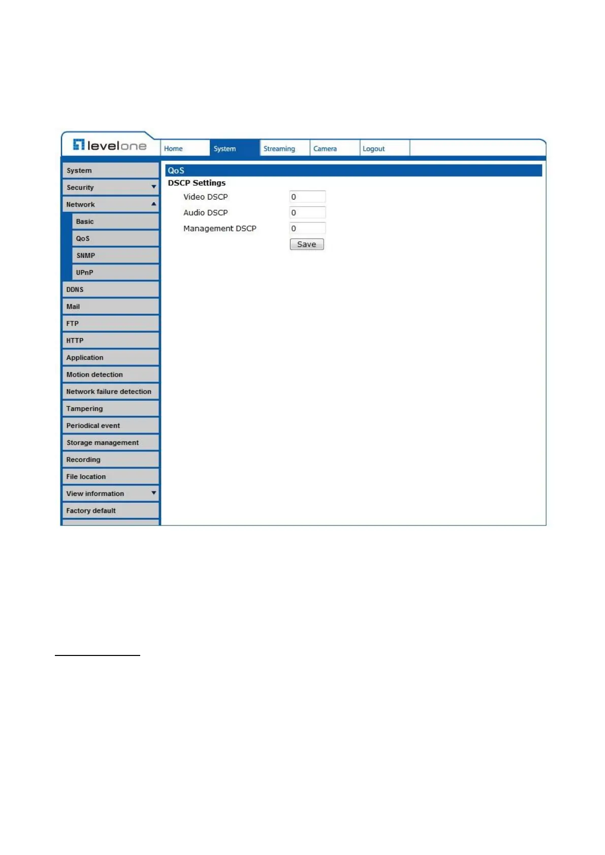 disabled. The IP Camera uses the following QoS Classes: Video, Audio and Management.