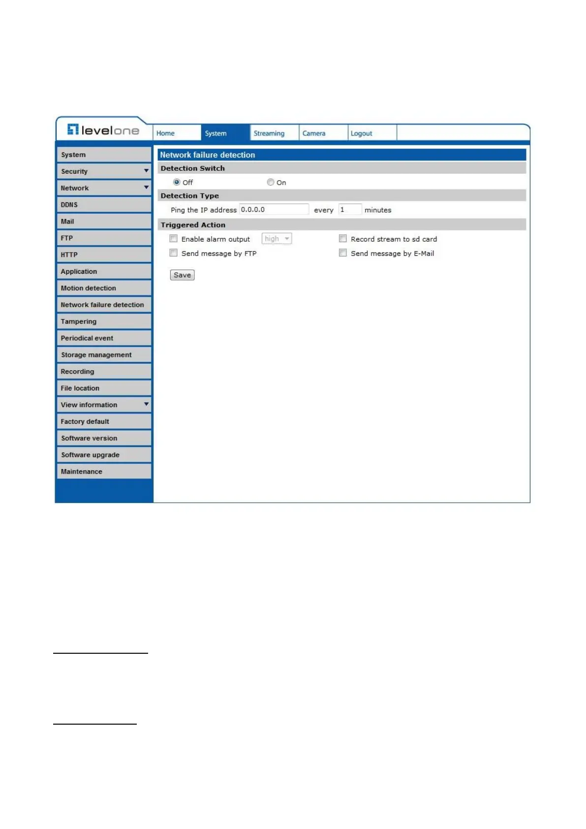 Network Failure Detection allows the IP Camera to ping another IP device (e.g. NVR, VSS,