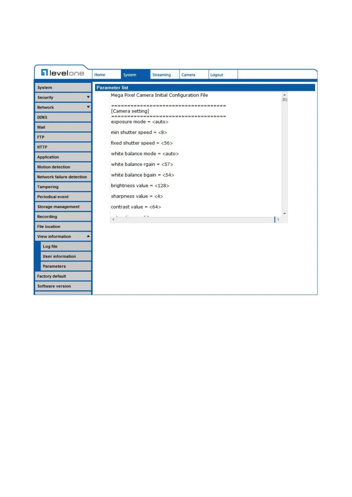 Click on this item to view the entire system’s parameter setting such as Camera Settings,