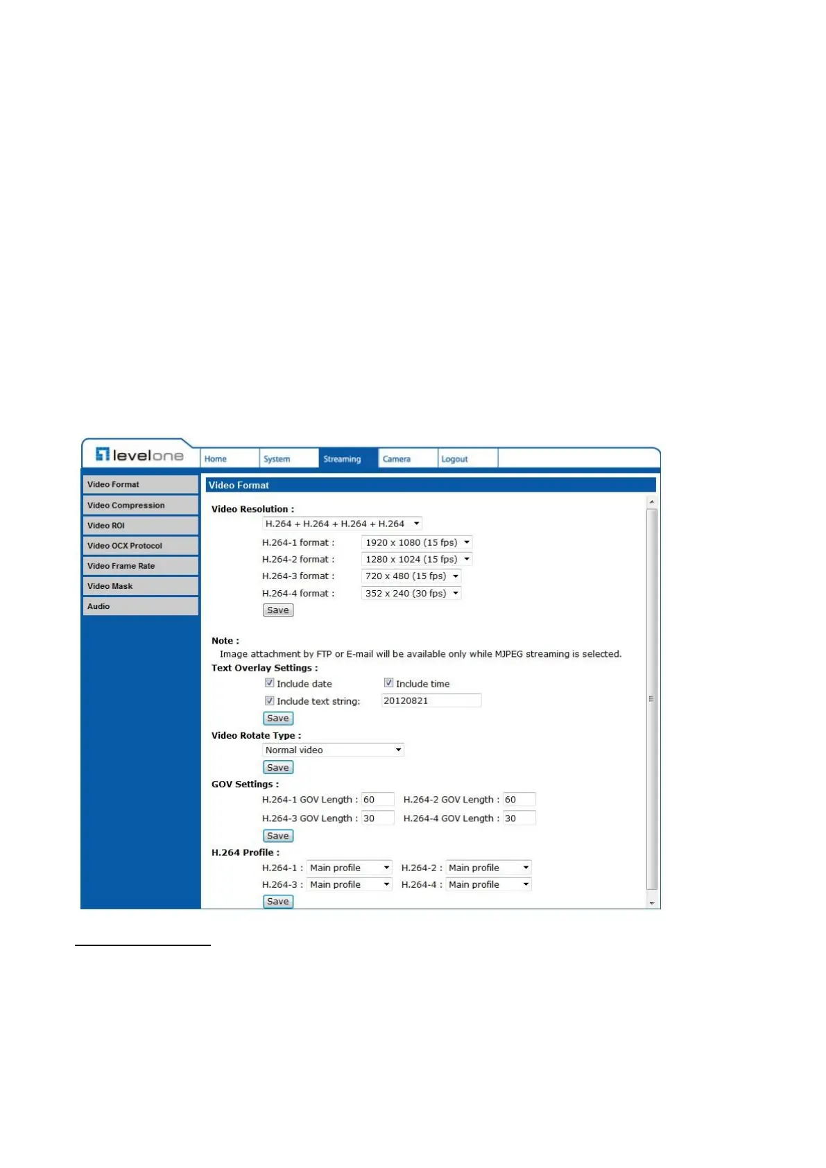 In the Streaming submenus, the Administrator can configure specific video resolution, video