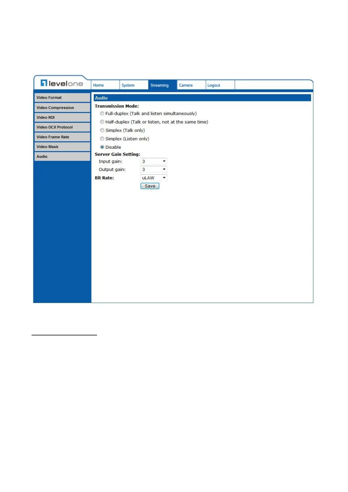 In the Audio page, the Administrator can select one transmission mode and audio bit rate.