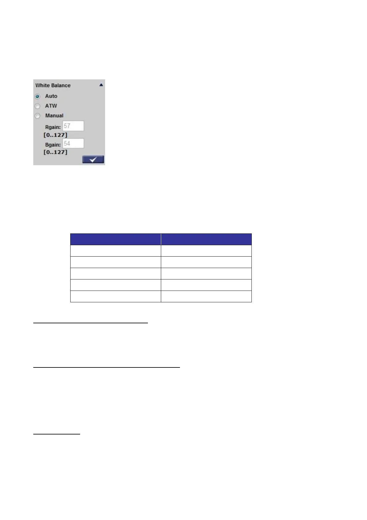 number between 0 ~127 of “Rgain/ Bgain” item to gain the red/ blue illuminant on the Live