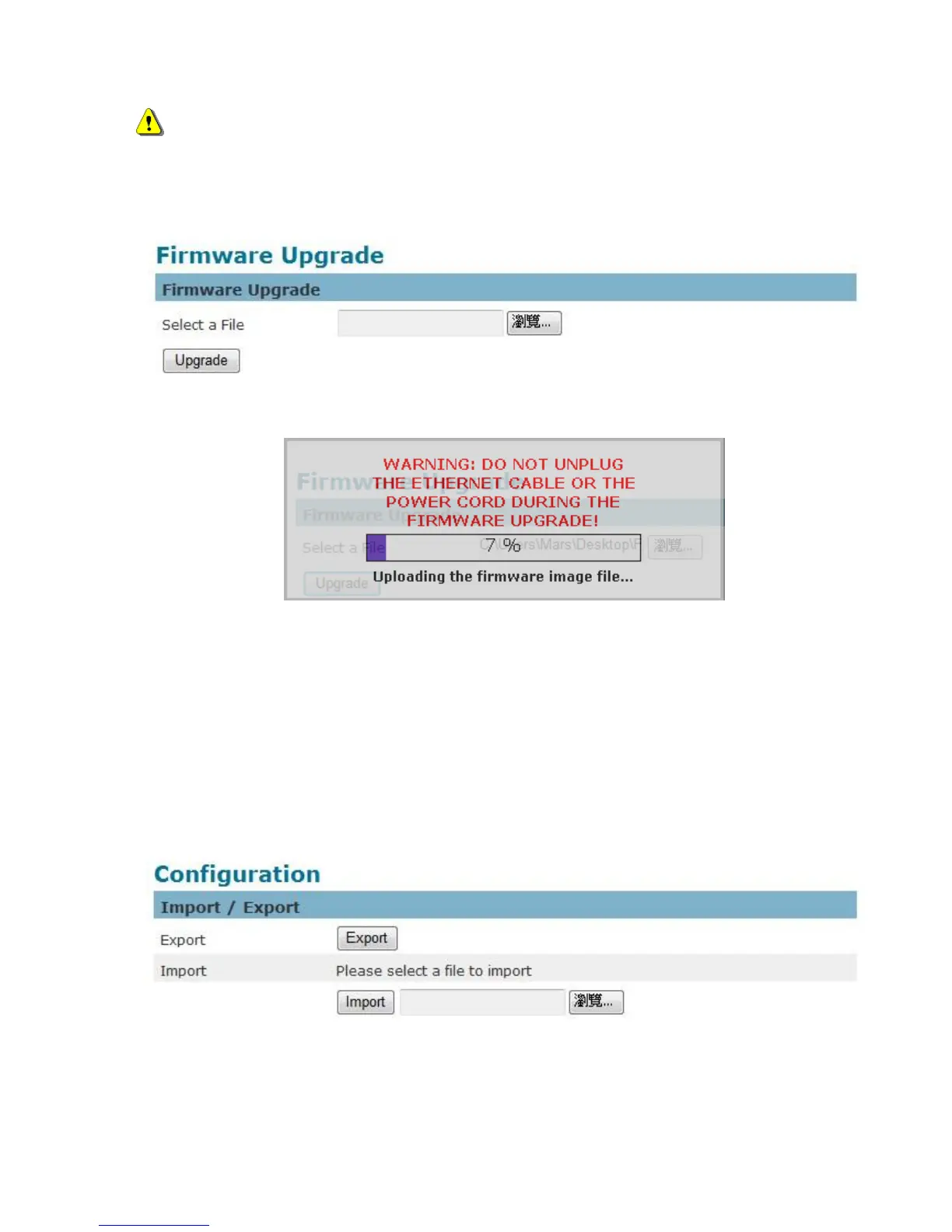 Upgrade - Click Browse… and specify the firmware file. Click Upgrade. The camera will
