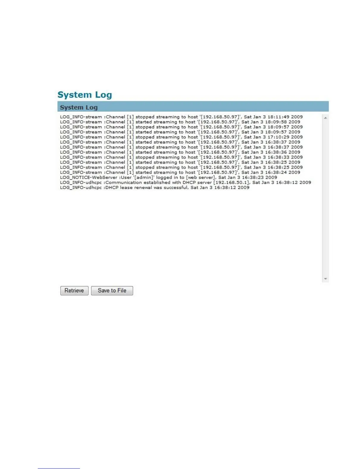 Click Retrieve to retrieve the log or click Save to file to save the system log.