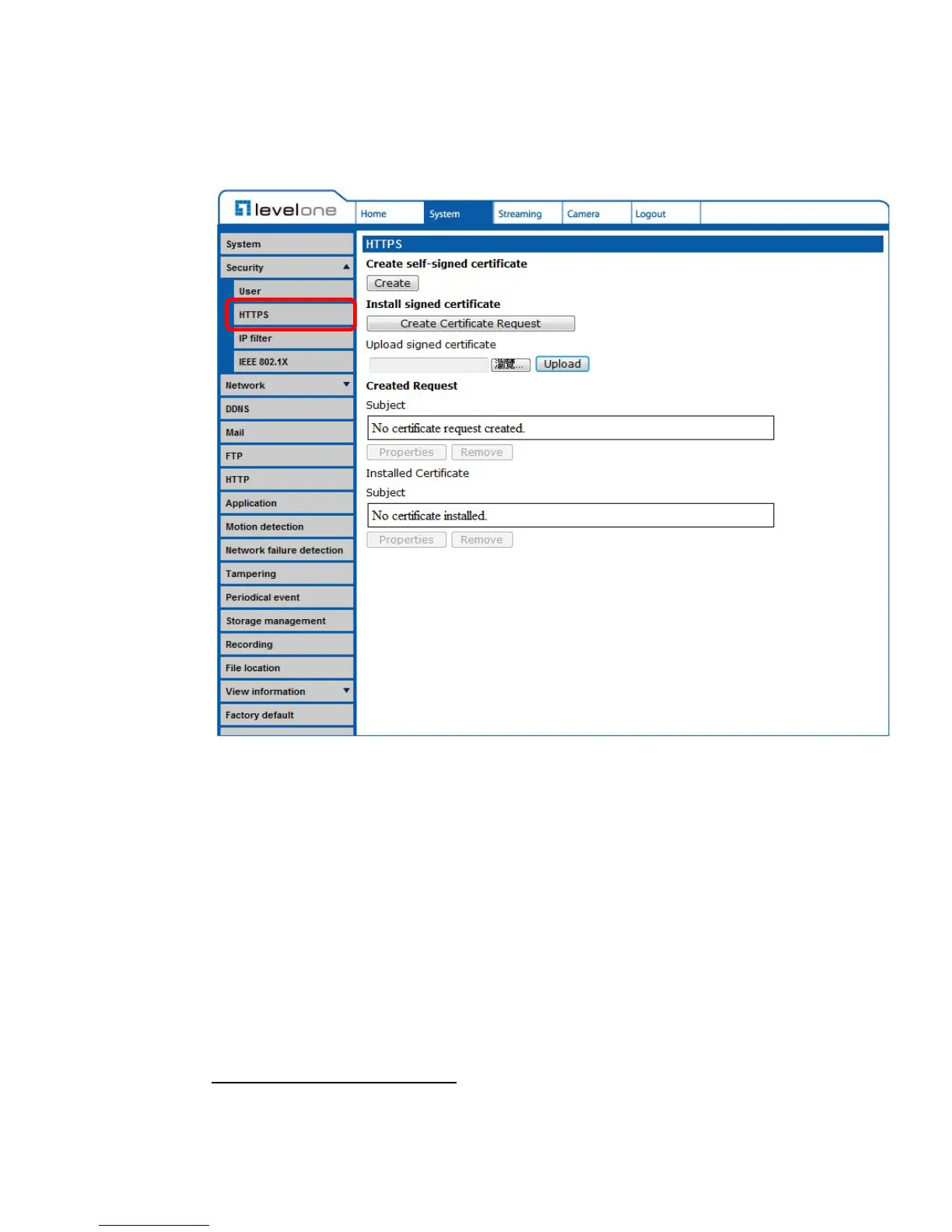 To use HTTPS on the IP Camera, a HTTPS certificate must be installed. The