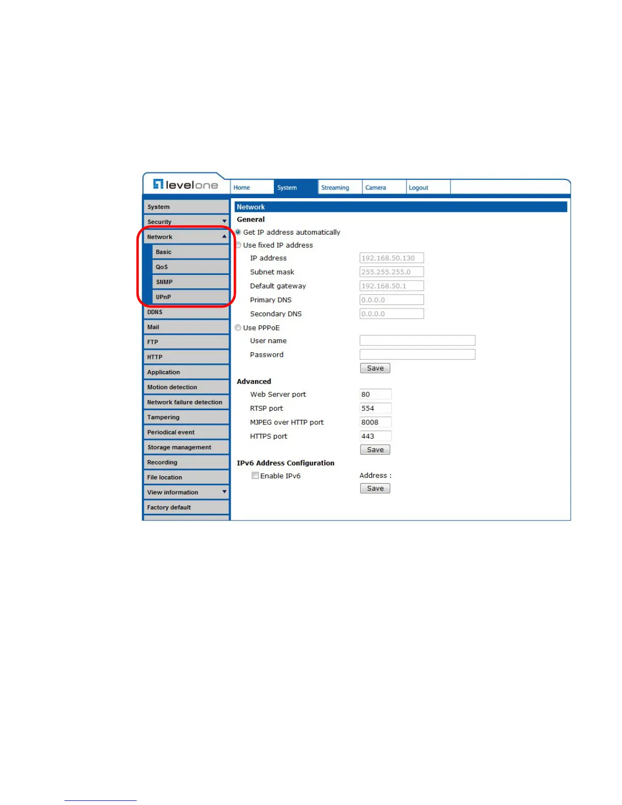 including <Basic>, <QoS>, <SNMP>, and <UPnP>.