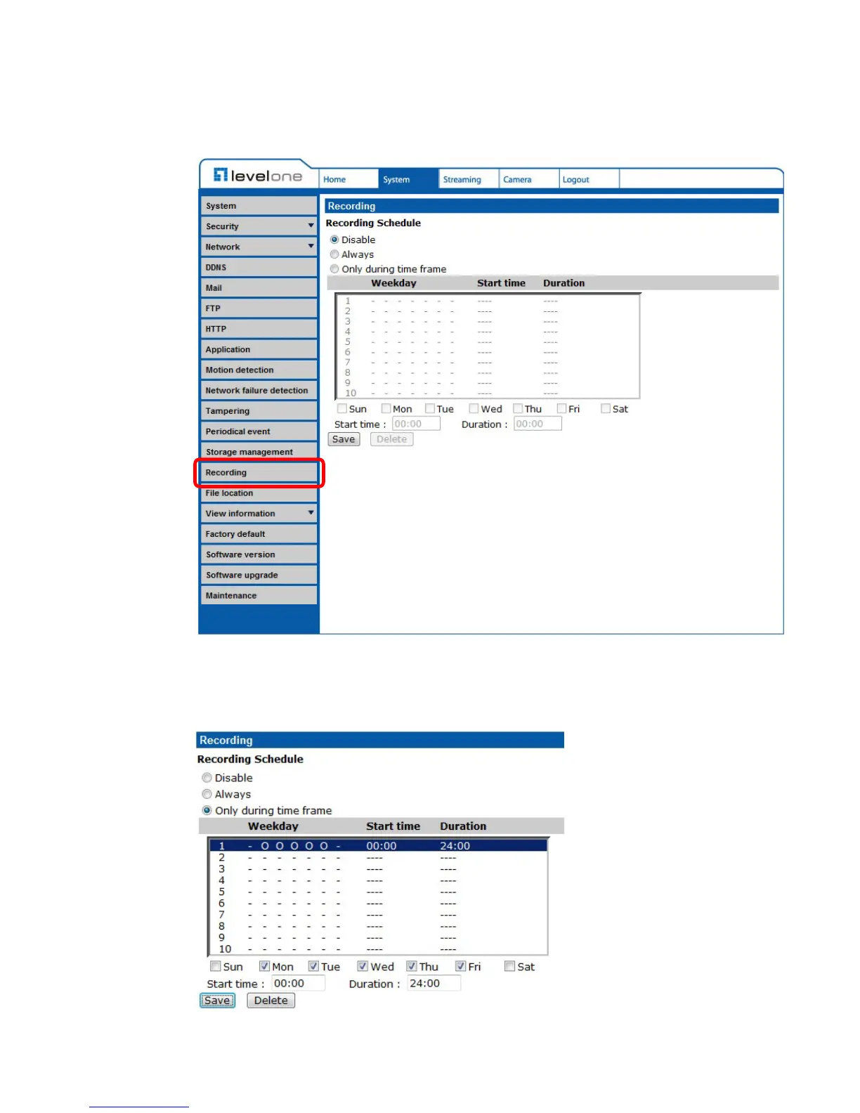 up to ten sets of time frames. User can specify the recording schedule to fit the