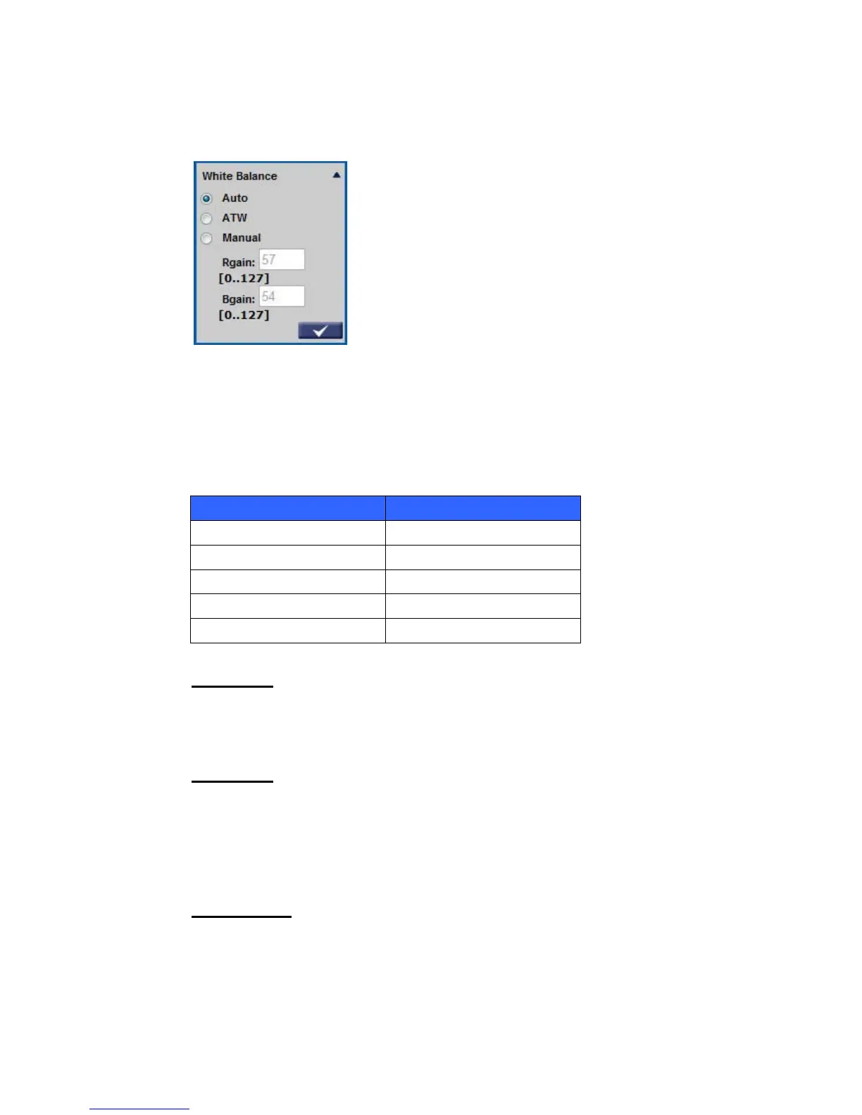 select a number between 0 ~127 of “Rgain/ Bgain” item to gain the red/ blue