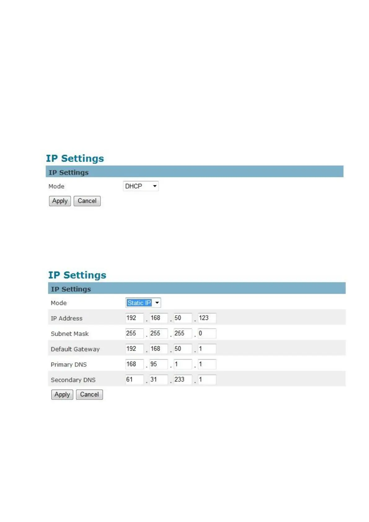 Select the desire setup mode from the IP settings drop-down menu.