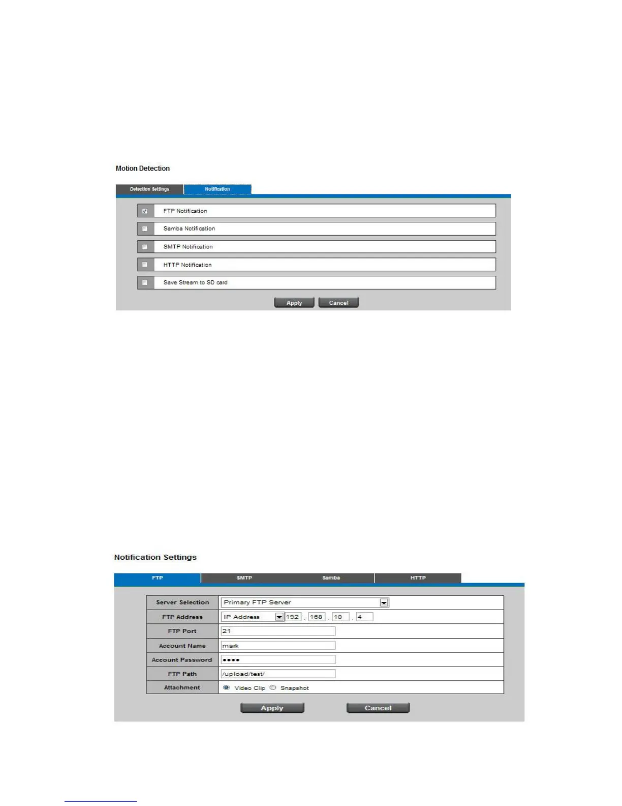 Network Camera sends buffered images to a FTP server, SMTP or Samba as notifications. In this