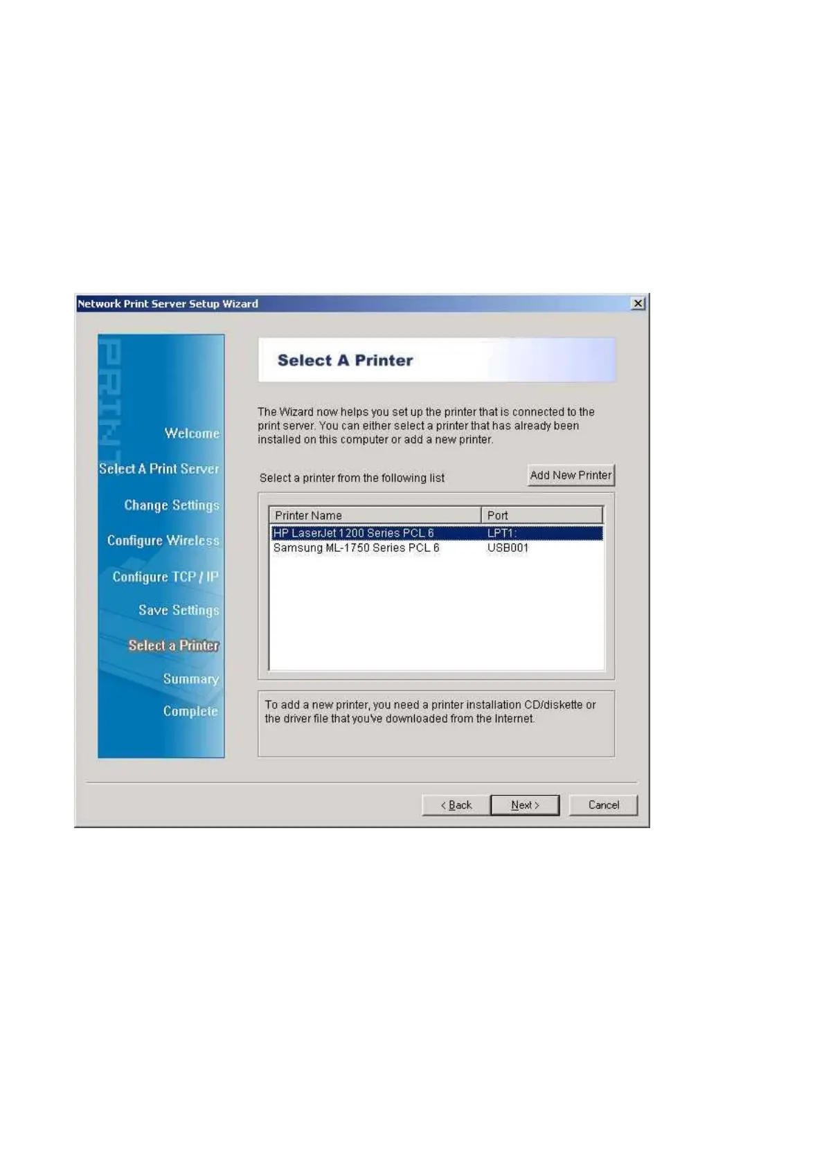 15. In the setup wizard, finish the installation by highlighting the installed printer in the