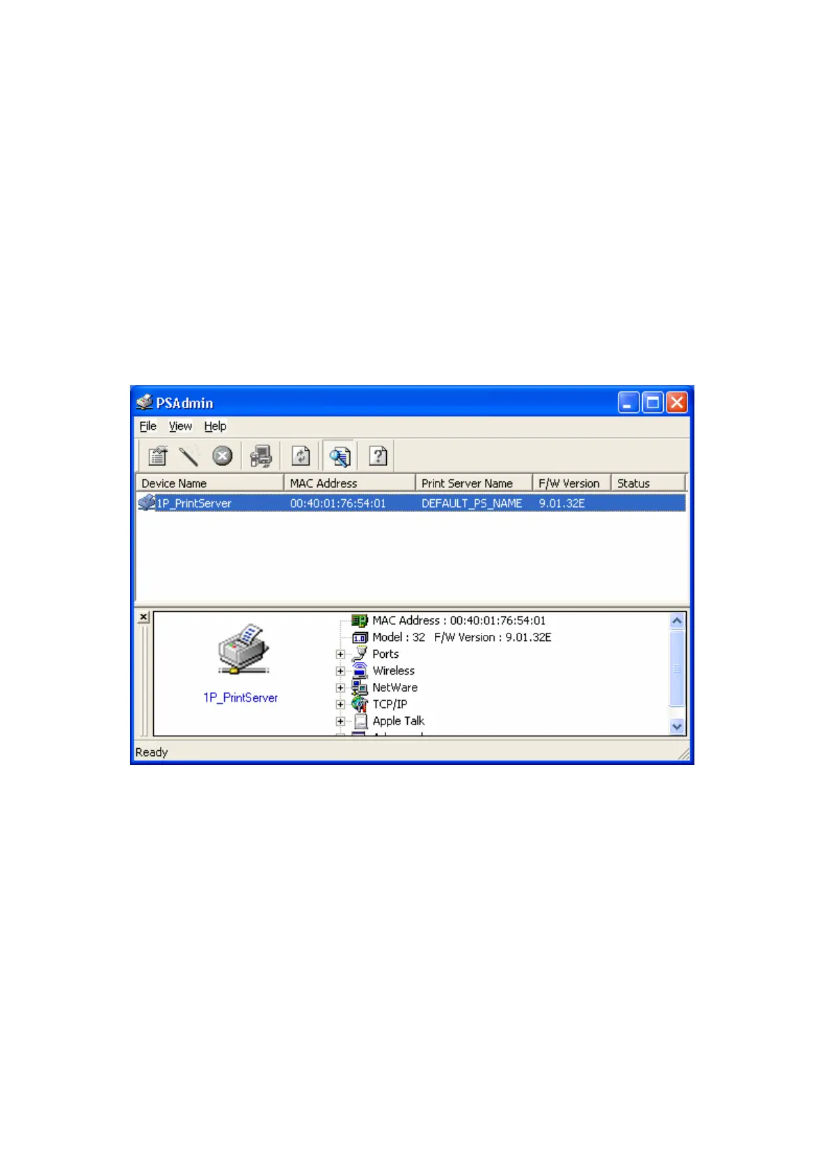 Windows Start menu: start -> All Programs -> Network Print Server -> PSAdmin. The