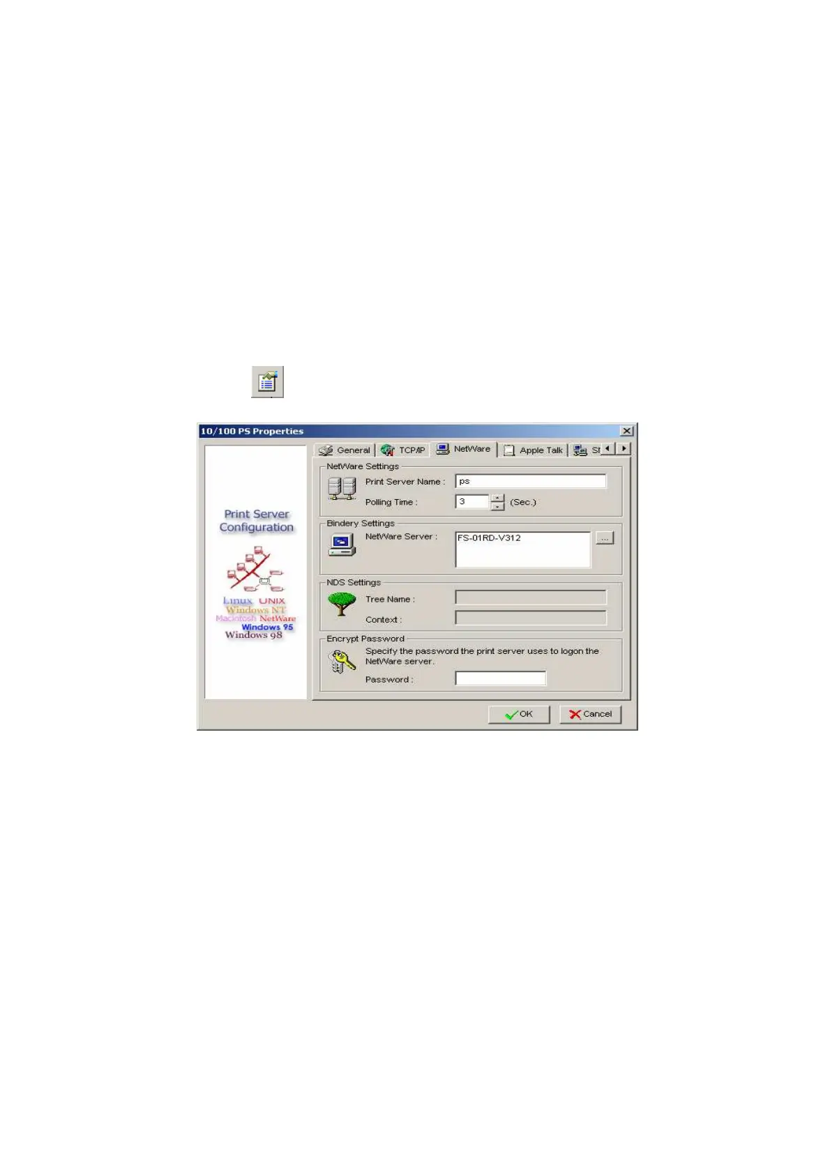 5. Select NetWare and type in the Print server that created during PCONSOLE.
