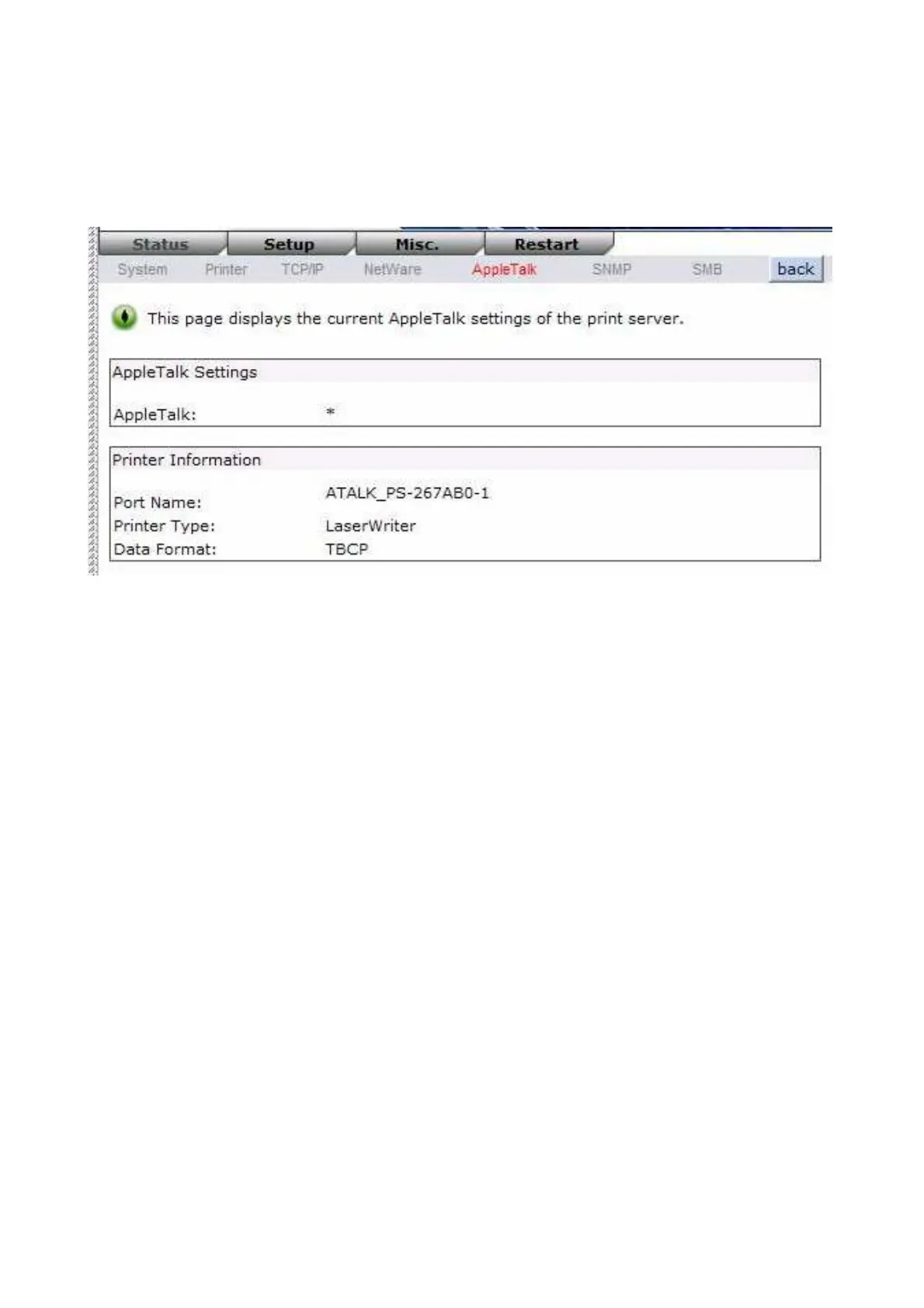 an asterisk (*) in the current AppleTalk Status of the print server in the web