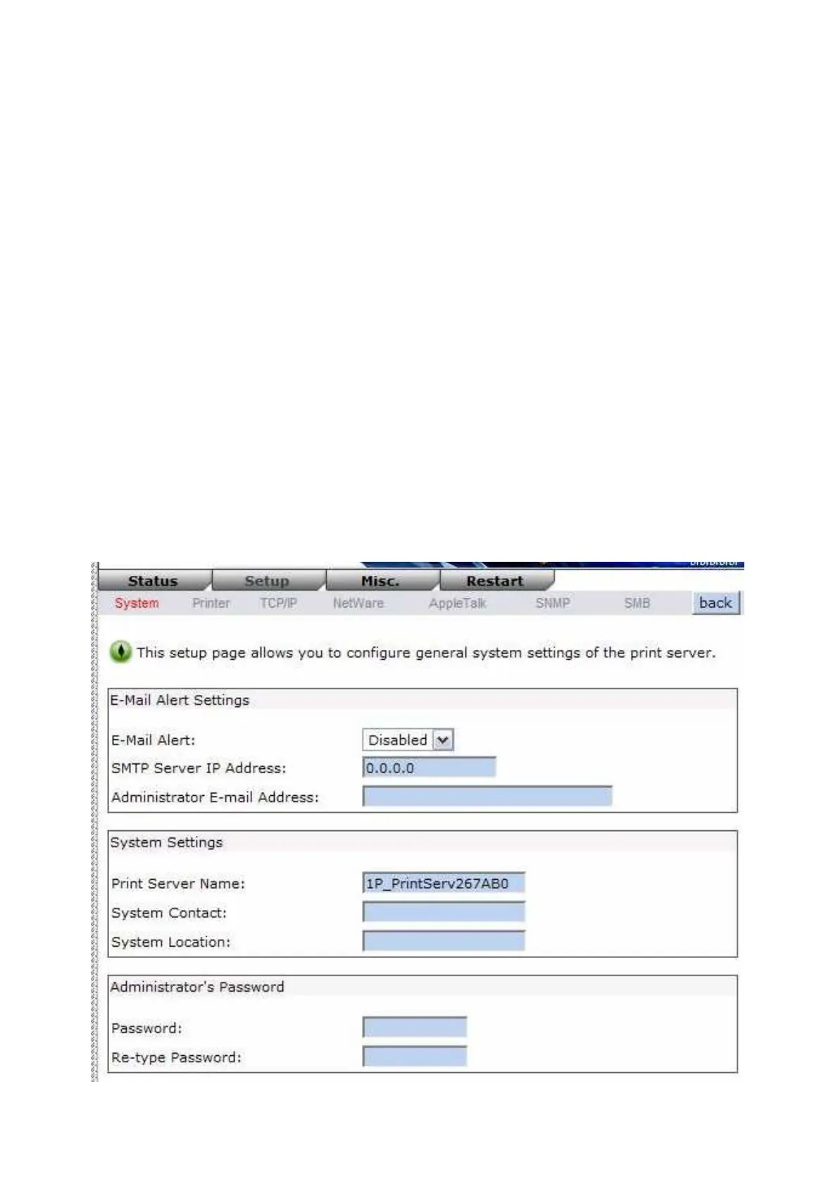 administrator to setup the print server’s System, Printer, NetWare, TCP/IP, SNMP and